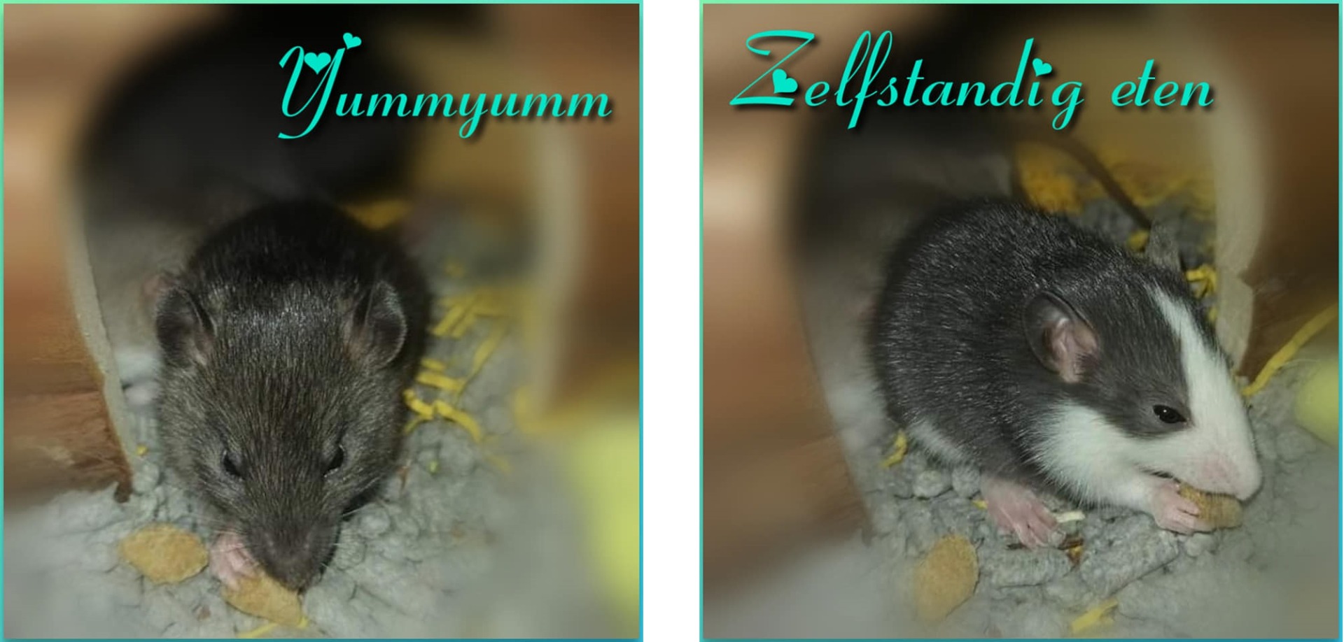 De rittens zijn vandaag eenentwintig dagen oud. Ze zijn verhuisd van het nest naar een mooi houten huisje in de kooi. Ze liggen er graag met z'n allen op één hoop. Mama houdt het huisje goed in de gaten en komt de rittens nog regelmatig melk geven. Naast het drinken van melk eten de jonkies nu ook vast voer. Ze eten de brokken die ik geen van Science Selective. Ze vinden het heerlijk om op te knabbelen!